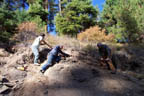 Motoring east toward Pendleton and the Blue mountains, we could not help but wonder if we might have some of the same good fortune fellow NARG members enjoyed at this locality a few weeks earlier. We were in quest of plant remains, particularly palm fronds (Sabilities eocenia). We arrived at our campsite about 6 PM. Our campmate Robert was already relaxing and thinking about dinner. We made short work of setting up camp, scrounging for firewood and preparing dinner. Enjoying a pleasant evening around the campfire, we discussed the geology fieldwork Robert had completed during the course of the day. The plant remains are have in the past been classified as belonging to the Clarno formation members, but subsequent study indicates the material could be included in the older Herron formation strata. There is something about the smell of pine trees and a star filled sky that makes for a refreshing sleep. We awoke to frost covered ground and hot coffee. Since dawn comes so late this time of year, we did not arrive at the digs until about 8 AM. We went right to work prospecting and in short order we were finding plant material. Since these specimens are large slabs; (most times several hundred lbs.) it pays to bring large pry bars, muscle and sweat to the party. We found 3 good specimens of Sabilites and numerous outer deciduous and conifer species by lunchtime. Robert located a great specimen that had been pushed over the edge of the road during roadwork. Or course the downside is: that now you must hoist the slab uphill and into your truck. Mission accomplished, we journeyed through the mountains toward Mitchell to hunt for ammonites. Arriving at camp just before sunset, we were rewarded with a gorgeous sunset. Sure enough, the weather guys were right! Rain: 6:30 AM. Hardly got the soil wet! We scoured around and located 3 or 4 suture specimens, then moved up the road to dig in a cut bank concretion locality. Robert discovered some nice small crab remains. Jim and Michael found some well preserved ammonites. Moving to another locality, raincoat weather, we located a small number of ammonites and Robert located a small Eurocrystes crab specimen. OK it is raining, time to head home. A good trip and fine company! Members present: Robert Rose', Michael Santino, Jim Scheirbeck, Bill Sullivan |